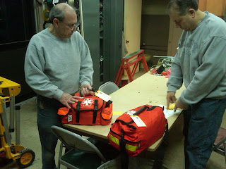 A handheld, 4 light, 12v box was acquired a year ago by CD. It was decided that the light should be fabricated to attach to a tripod and be able to run on a regular 12v power plug. The cord was rewired last week and then this week was taken apart and then using plywood and screws, attached to a tripod. The light will be useful in any regular vehicle with a 12v outlet, a large battery, and can be used by our portable power packs. The light can be used for search and rescue when using a generator might not be available or not when lighting is needed in a quiet environment. A yearly inspection of our first aid kits was done last night. We have a medical cabinet with fully stocked first aid packs for deployments and events. Also first aid stations are on each truck and our LEPC trailer. The trailer has a larger kit for multiple victims or a shelter deployment.